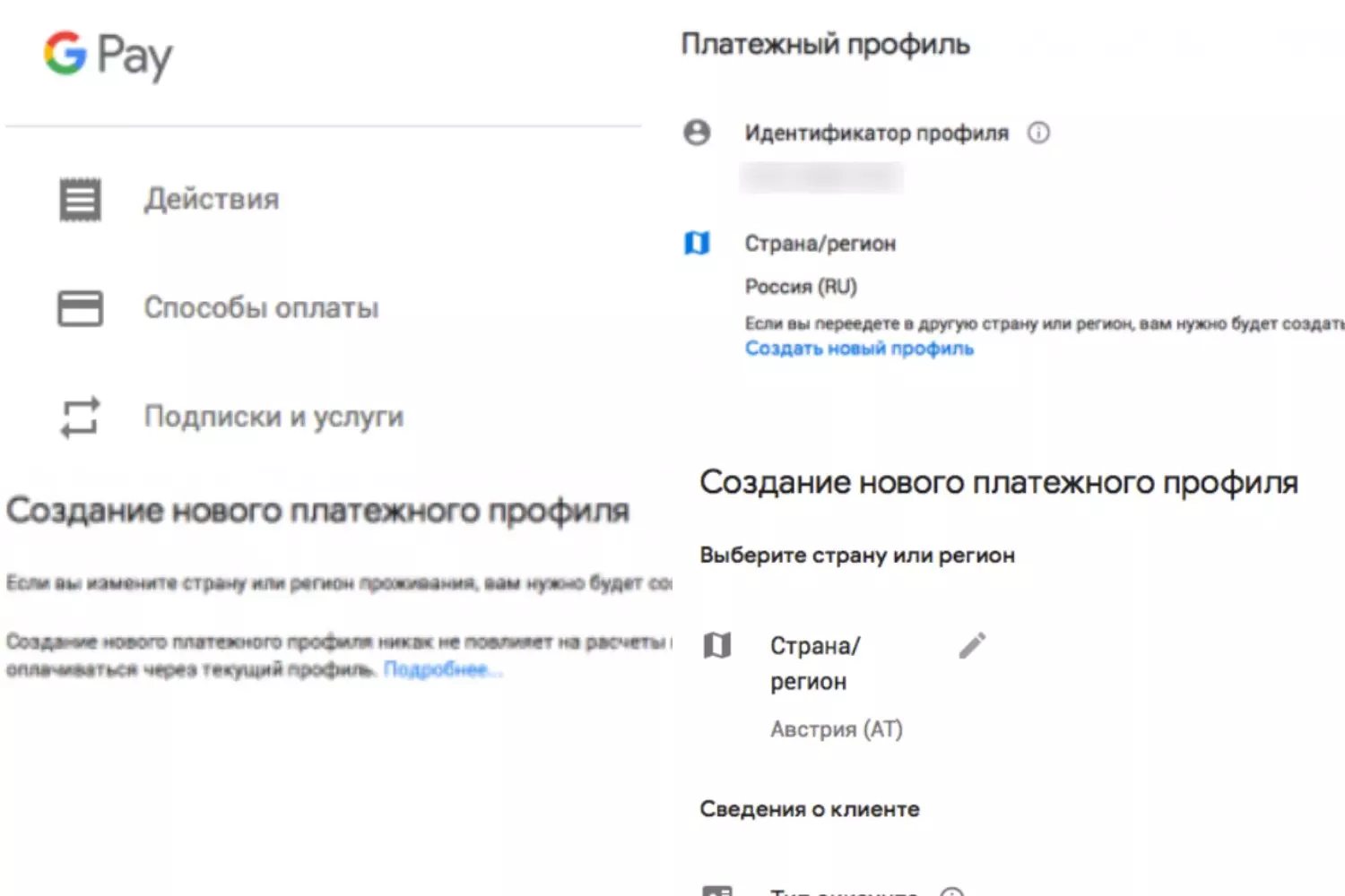 - Далее пользователю необходимо создать новый платежный профиль, в котором следует указать необходимую страну.