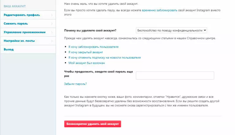 После того, как вы выберете этот пункт, Instagram предложит вам указать, почему вы приняли такое решение. Ее нужно выбрать из раскрывающегося списка, а действие подтвердить введением пароля. Затем нужно нажать «Безвозвратно удалить мой аккаунт».